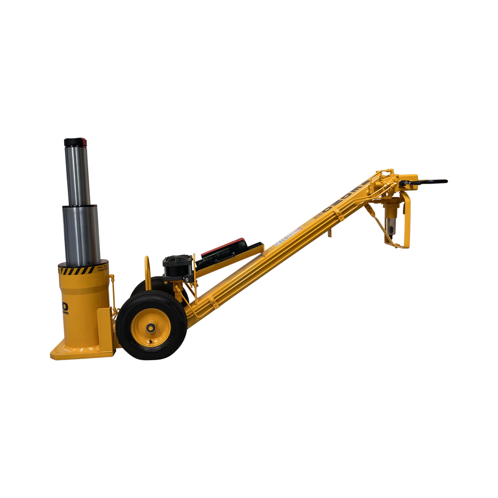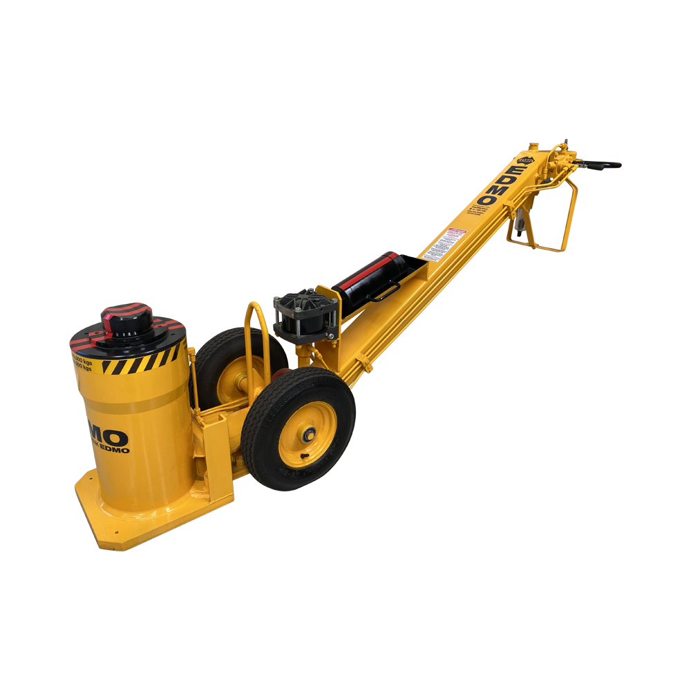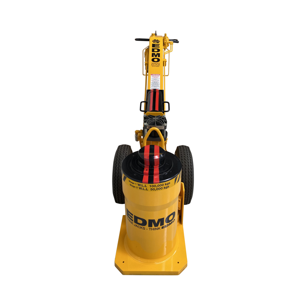 This is a 2 stage hydraulic jack powered by an air pump. It is operated from the end of handle, away from the jack operations. The jack is power up and power down. Safety is a feature of the UPDT100/50 having a pilot operated lowering control valve which requires the Jack to be pumped down thus providing protection against a free fall and gives complete control over the lowering process.